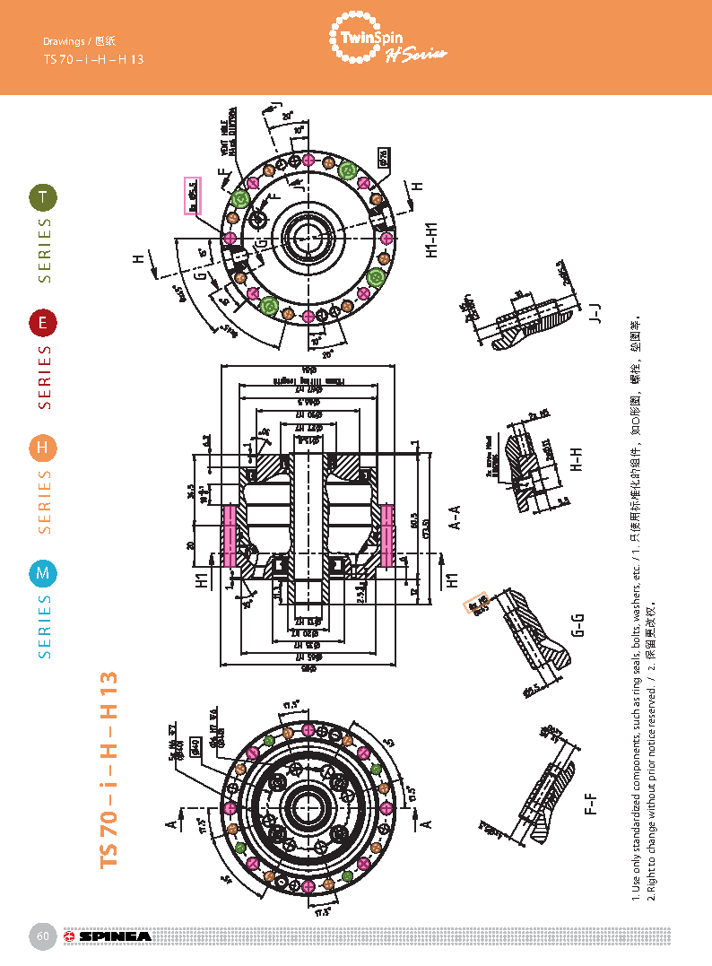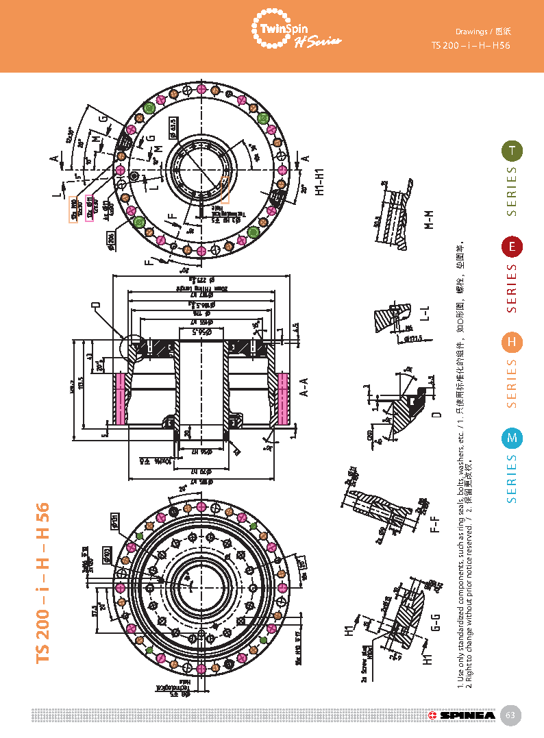 H 系列是帶有中空孔的Twinspin高精度減速機。電線,壓縮空氣管道,驅動軸可從減速機中間穿過。 該系列為完全密封,內部注有終生免維護油脂。 減速機包含精密減速機構和高強度交叉滾子軸承,故又名“軸承式減速機”。這種設計可以把負載直接安裝在減速機輸出法蘭上,省去輸出端的額外軸承。